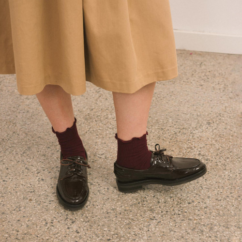 Glossy models are made from soft natural leather coated with a layer of lacquer with a slightly crinkled texture, known as naplak. Like all leather shoes, they crease where the foot bends, and these creases are a natural sign of wear.