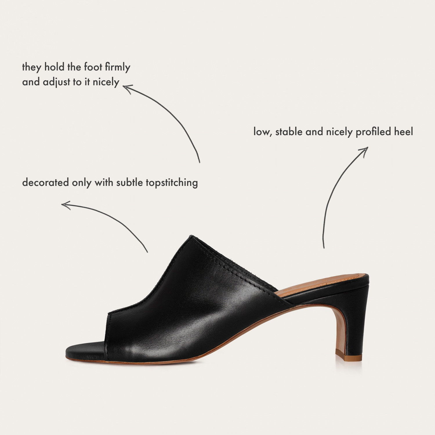Classic slides are the best slides. Even those heeled ones! Ginaa are a new version of our first heeled slides from years ago - Park. They have a low, stable and nicely profiled heel and a soft upper made of velor or genuine leather. They’re simple peep-toe slides that have no back buckle, but they hold the foot firmly and adjust to it nicely. They are minimalistic, decorated only with subtle topstitching. Ginaa are great for this and next seasons.