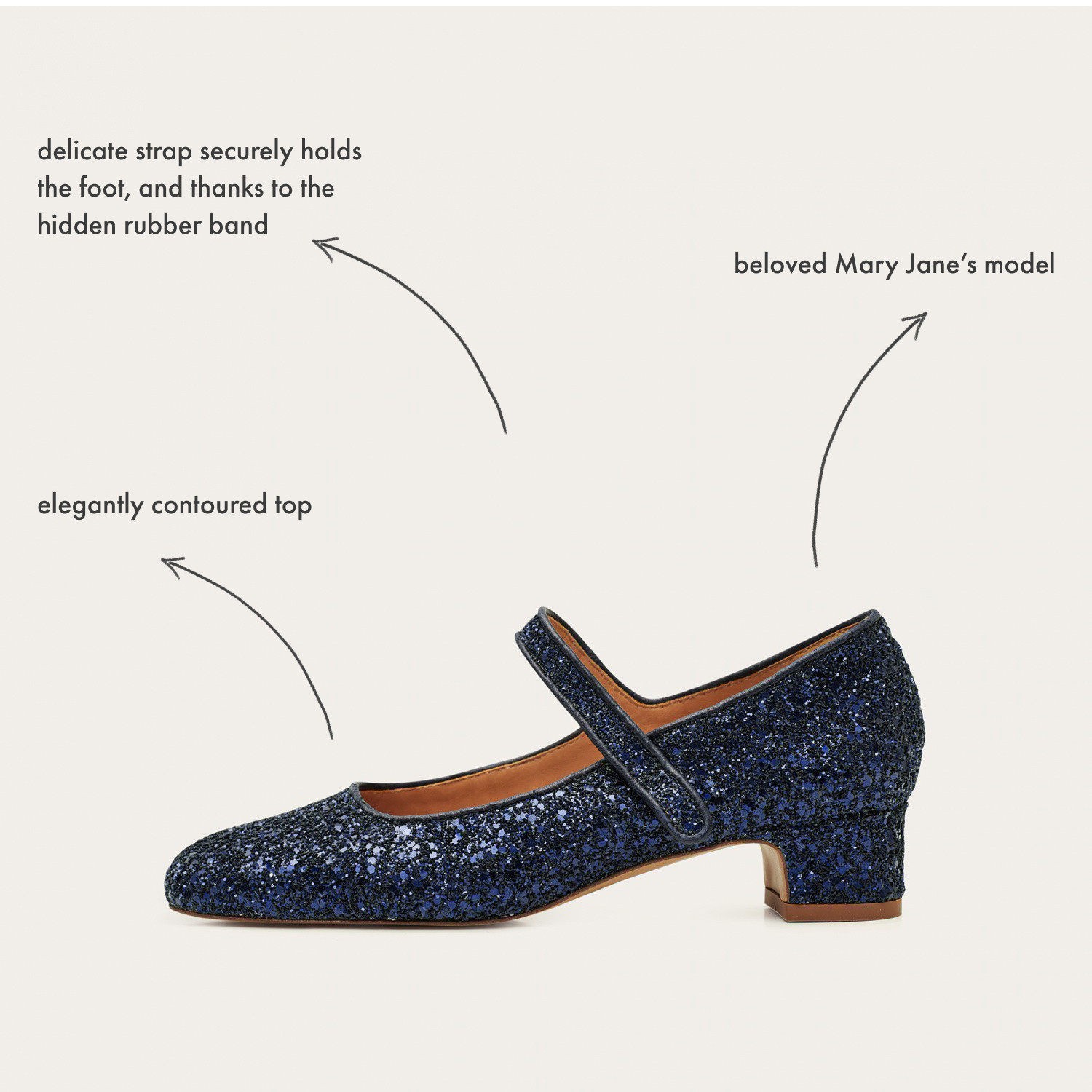 Dora is a classic pump inspired by the famous and beloved model Mary Jane. They have an elegantly contoured top and a comfortable, wide cut-out. The delicate strap securely holds the foot, and thanks to the hidden rubber band, sewn into the upper, it stretches easily and adjusts to both the higher and lower foot arch. The new mid-heeled Dora model is even more comfortable and universal than its higher variant - the bestseller of the past season.