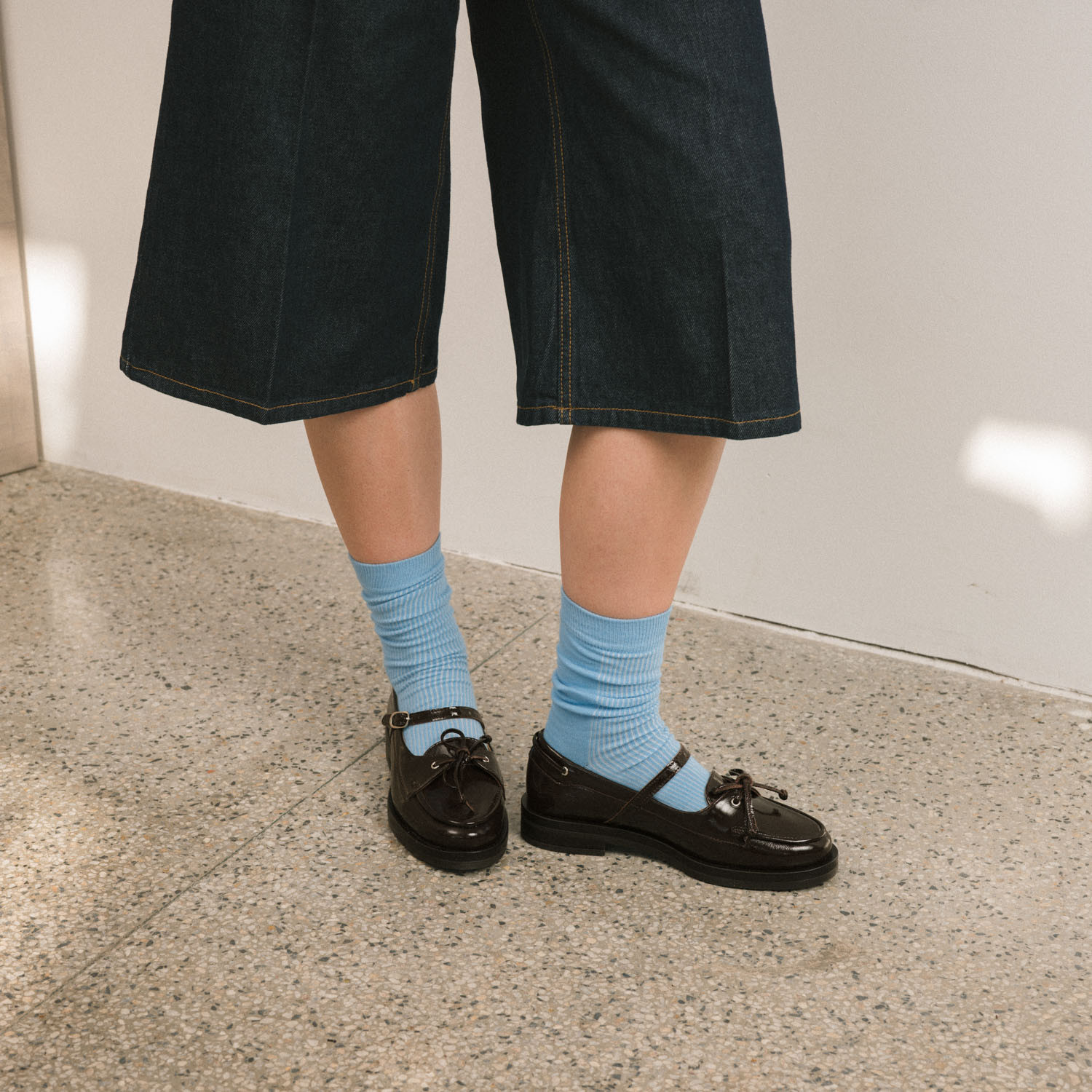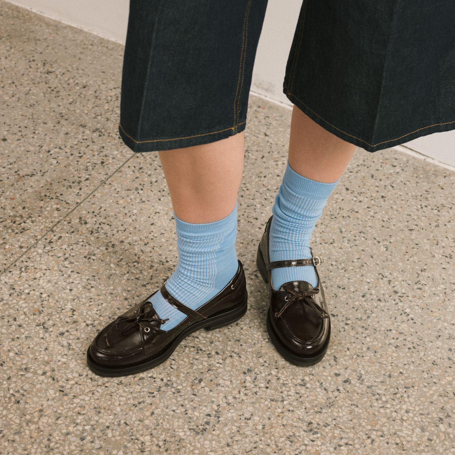 Glossy models are made from soft natural leather coated with a layer of lacquer with a slightly crinkled texture, known as naplak. Like all leather shoes, they crease where the foot bends, and these creases are a natural sign of wear.