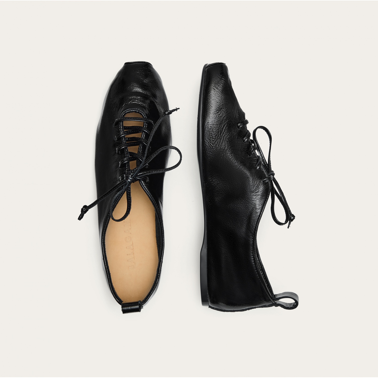 Modele z połyskiem wykonane są z miękkiej skóry naturalnej pokrytej warstwą lakieru o lekko gniecionej teksturze zwanej naplakiem. Te modele jak wszystkie skórzane buty marszczą się w miejscach zginania stopy, a zgniecenia są naturalną oznaką użytkowania.